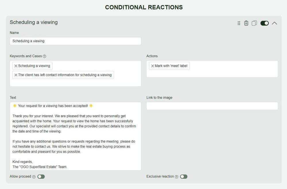 For the OLX chatbot to recognize situations, you need to enable the corresponding block in the bot's settings. Once this block is enabled, the system will analyze every customer message to see if it matches any of the predefined cases set in conditional reactions. This is useful when you need the bot to respond not only to simple commands but also to specific situations described in the dialogue.
