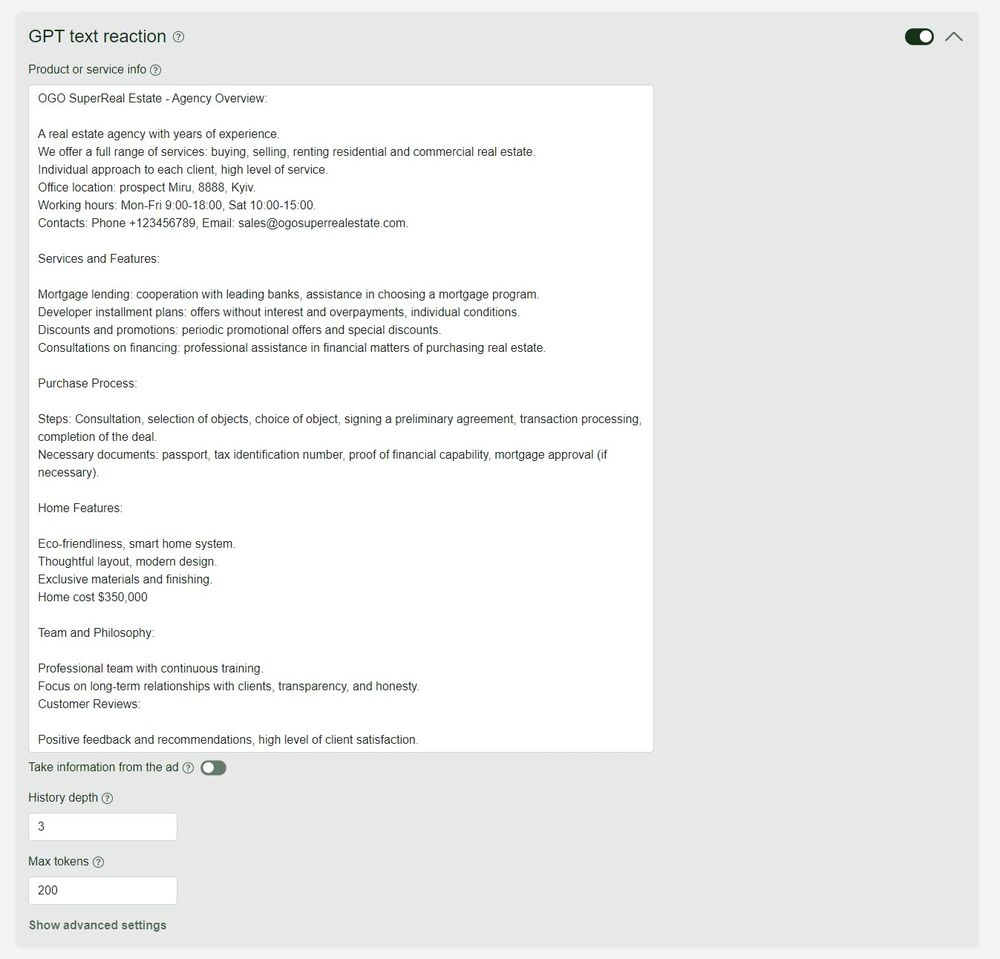 - Instructions for GPT: In this field, you can define the chatbot’s tone and communication style. You can specify the language, tone, and manner of communication, as well as what the chatbot should avoid or must mention. For example: "Be polite, avoid discussing discounts," "You are not allowed to accept orders; your job is to provide information." You can also define the main goal of the dialogue so the chatbot knows what to achieve. For example: "Your primary goal is to obtain the customer’s phone number," "Minimally respond about the listing; the goal is to get the customer to call." The more specific the instructions, the better the chatbot will follow your expectations.